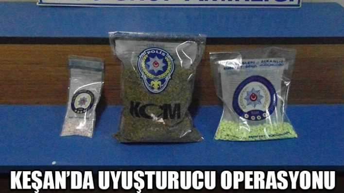 Edinilen bilgiye göre, Edirne İl Emniyet Müdürlüğü Uyuşturucu İle Mücadele Şube Müdürlüğü ve Keşan KOM Grup Amirliği görevlilerince yapılan operasyonda, Keşan’da 59… plakalı bir araçta yapılan aramada, 781,39 gr uyuşturucu maddelerden sentetik kannobionid ( bonzai) maddesi ve toplam 594 adet uyuşturucu maddelerden ectasy hap ele geçirilerek el konuldu. Araçta bulunan N.C. S.F.ve M.D. isimli şahıslar ise gözaltına alındılar. Olayla ilgili soruşturma sürüyor.