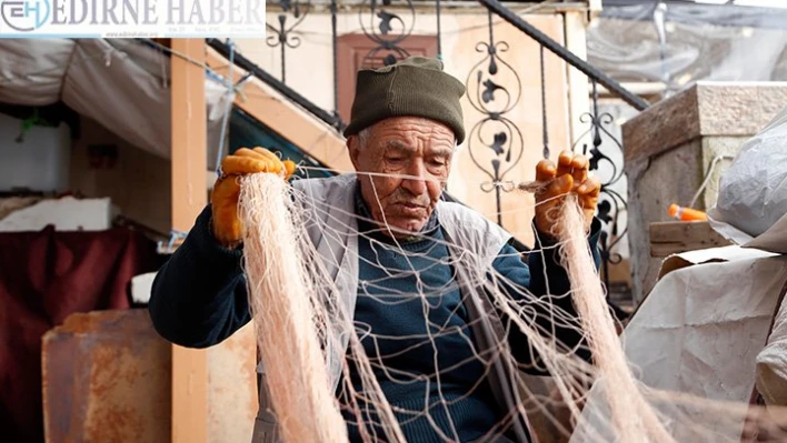 88 yaşındaki Fehmi Faytoncu,  ağ onarıyor