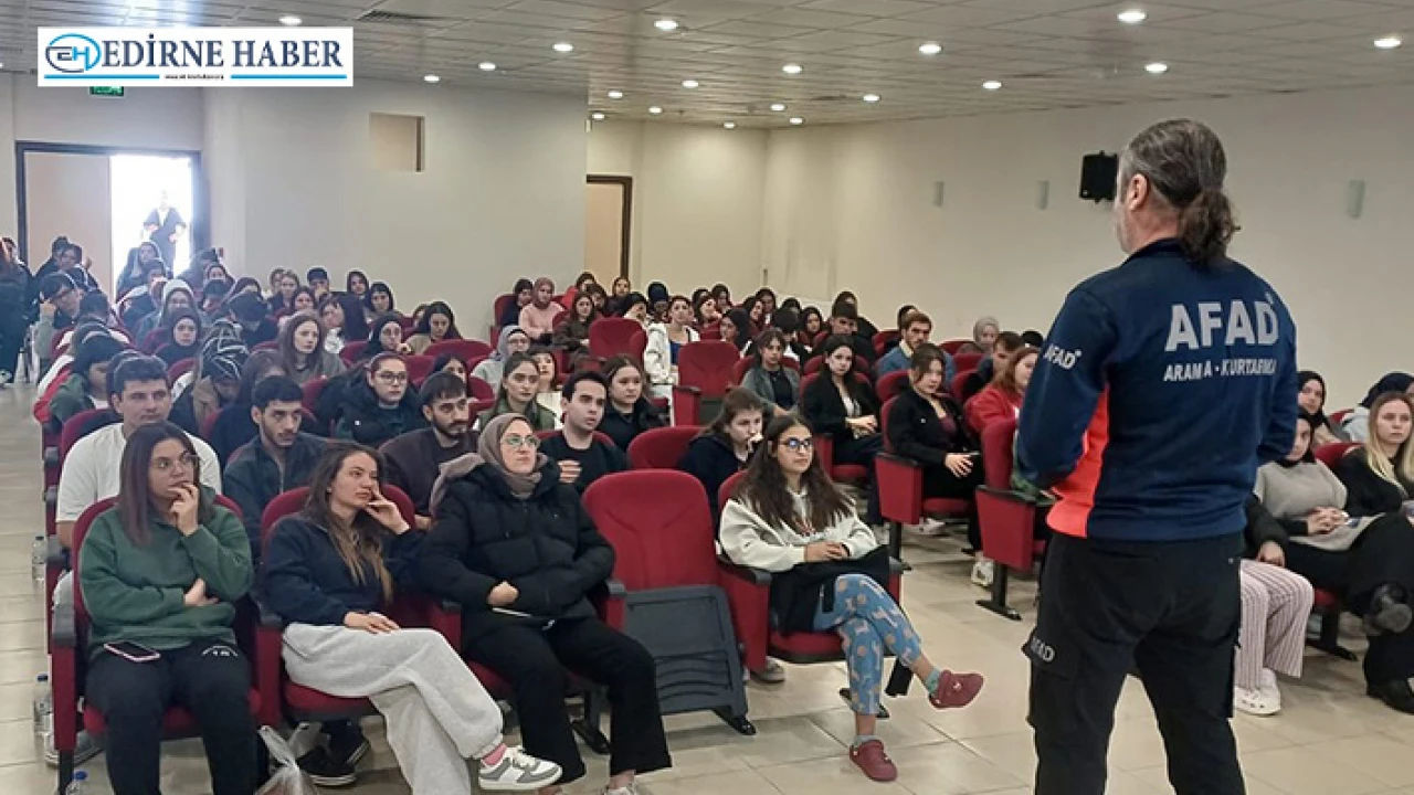 Edirne Afet ve Acil Durum Müdürlüğü (AFAD) ekipleri, Keşan, İpsala ve Uzunköprü'deki Kredi Yurtlar Kurumu (KYK) yurtlarında kalan öğrencilere afet farkındalık eğitimi verdi. Eğitim çerçevesinde öğrencilere afetlerle ilgili bilgilendirici broşürler ve afişler de dağıtıldı.