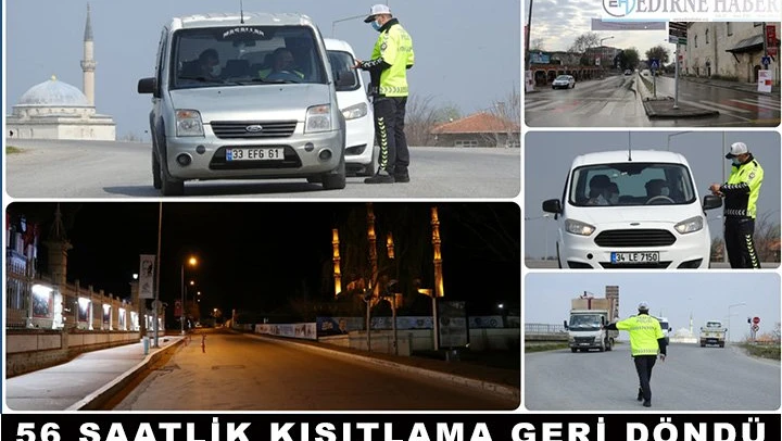 Kovid- 19 salgını ile mücadelede kontrollü normalleşme dönemi ile birlikte illerin risk durumlarına göre hafta sonu uygulanan sokağa çıkma kısıtlaması yeniden düzenlendi. Bu kapsamda kırmızı kategoride ve çok yüksek riskli iller arasında yer alan Edirne'de bu hafta sonu ilk kez 56 saatlik sokağa çıkma kısıtlaması uygulandı.