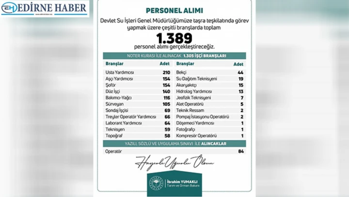 Tarım ve Orman Bakanı İbrahim Yumaklı, personel alımına ilişkin yaptığı açıklamada, Türkiye genelinde yürütülen su ve toprak kaynaklarının yönetimi çalışmalarında insan kaynağının büyük önem taşıdığını vurguladı. Bakan Yumaklı, açıklamasında şu ifadeleri kullandı: 'Devlet Su İşleri Genel Müdürlüğümüz tarafından taşra teşkilatında görev yapmak üzere 1.389 yeni çalışma arkadaşımız ailemize katılıyor. Ülkemizin dört bir yanında görev alacak yeni çalışma arkadaşlarımıza şimdiden kolaylıklar diliyorum. Hayırlı uğurlu olsun.'
