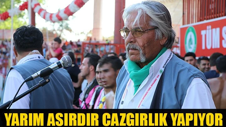Cazgırlık görevini ilk günkü heyecanıyla yerine getiren Pele Mehmet, er meydanının yarım asırdır sesi olmaya devam ettiriyor.