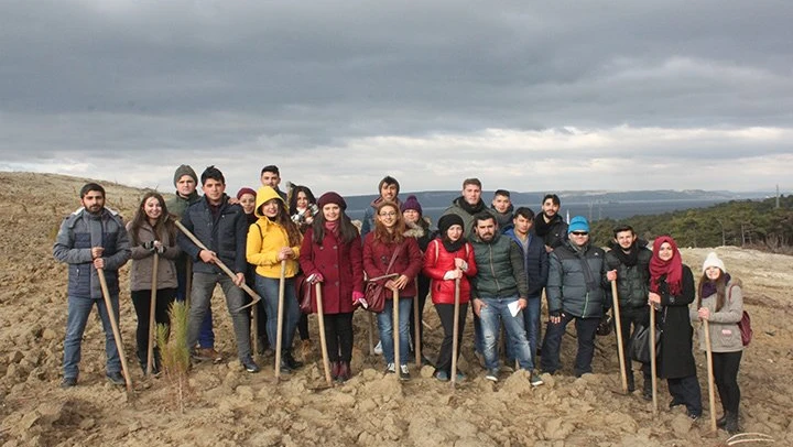 Çanakkale Onsekiz Mart Üniversitesi (ÇOMÜ) Eğitim Fakültesi Sosyal Bilgiler Öğretmenliği Bölümü öğrencileri, Güzelyalı'da bir süre önce yanan ormanlık alana fidan dikti.