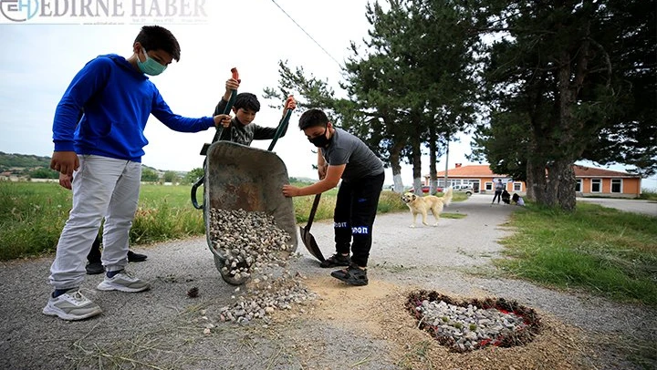Kırklareli'nde, köy çocuklarının taşımalı sistemle eğitim gördüğü İnece Ortaokulu öğrencileri görsel sanatlar derslerinde boya ve kağıt kullanmak yerine taş, yaprak ve dallarla toprak üzerinde çalışmalar yürütüyor.