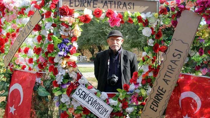 Edirne'de seyyar fotoğrafçı 66 yaşındaki Şemsi Türk, tarihi Selimiye Camisi önünde yerel ağızla "H" harfini yutup, "Bir kare 'Edirne Atırası' ister misiniz?" diye seslenerek müşterilerini bekliyor.