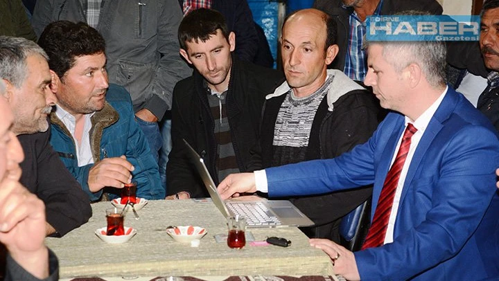 Lapseki'nin Adatepe köyüne Kaymakam Tahir Şahin ve Ziraat Odası Başkanı İsmail Sevim ile giden Candan, burada genç çiftçilere proje hakkında bilgi verdi.