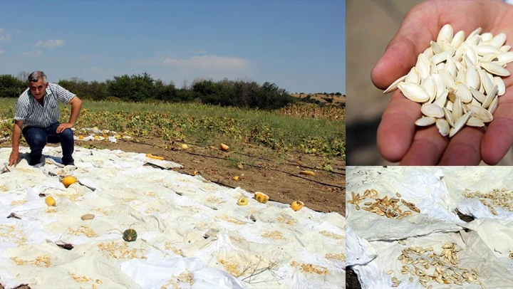 Trakya Üniversitesi Mühendislik Fakültesi Genetik ve Biyomühendislik Bölümünce gerçekleştirilen ıslahı çalışmalarıyla ekimi yapılan kabak çekirdeği laboratuvar incelenmesi için hasadın ardından bulunduğu alanda kurutuluyor.
