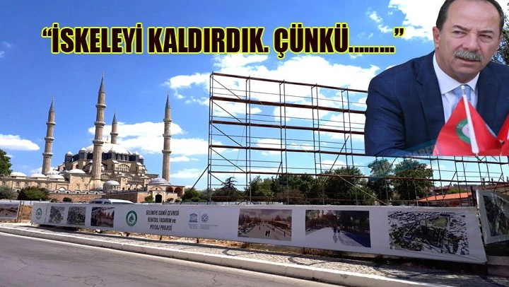 Selimiye Cami önündeki alana Edirne Belediyesi tarafından kurulan iskelenin kaldırılacağını belirten Belediye Başkanı Recep Gürkan, iskeleyi bir amaç için kurduklarını ve amaç geliştiği için iskelenin söküleceğini söyledi.