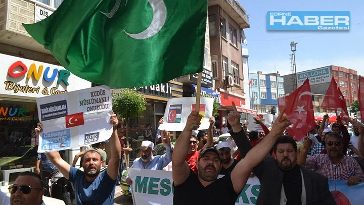 Keşan Eğitim ve Dayanışma Konfederasyonu tarafından düzenlenen protesto gösterisinde, yaklaşık 100 kişilik grup, Hastane Caddesi'nden Cumhuriyet Meydanı'na kadar yürüdü. Grubun yürüyüşü sırasında, ABD ve İsrail'i lanetleyen sloganlar atıldı. Yürüyüş sırasında, ABD ve İsrail bayrakları yakıldı.