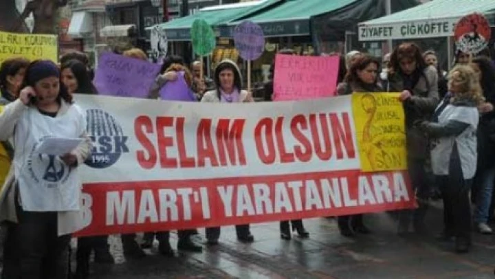 “Erkek egemen sistemin “8 Mart, kadını şımart” sloganıyla yüzümüze fırlattığı karanfillere inat; isyandayız, ayaktayız, kavgadayız” diyen kadınlar, kadın bedeni üzerindeki tüm söz ve karar hakkının kadına ait olduğunun kabul edilmesini, siyasi iktidarların kadının bedeninden elini çekmesini istedi.