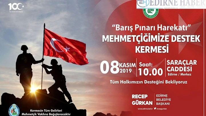 8 Kasım Cuma Günü Saraçlar Caddesi'nde Saat:10.00'da başlayacak olan kermese tüm Edirne Halkı'nı davet eden Edirne Belediye Başkanı Recep Gürkan, “Barış Pınarı Harekatı'nda görev yapan Mehmetçiğe destek vermek için geliri Mehmetçik Vakfı'na aktarılacak olan büyük bir kermes yapacağız. Kermesimiz, katkı sunmak isteyen herkese açık. Tüm vatandaşlarımızı, sendikaları, dernekleri, sivil toplum örgütlerini kısacası herkesi 8 Kasım Cuma Günü düzenleyeceğimiz kermese davet ediyorum” dedi.