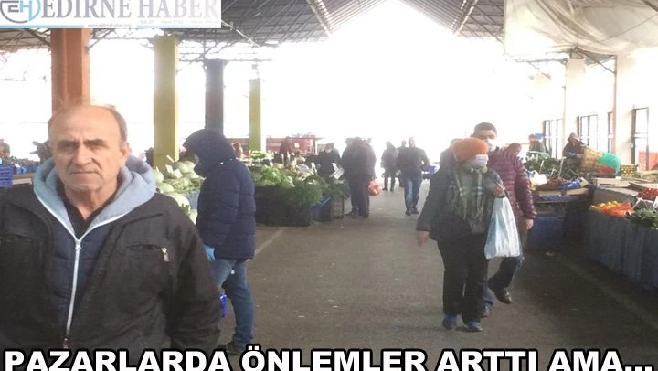 Edirne'de koronavirüs tedbirleri kapsamında pazarlara giriş ve çıkışlar kontrollü şekilde sağlanıyor. Pazar yerlerinde tezgahların ve tahtaların arasında 3 metre mesafe bırakılması gerektiği belirtilen genelgede pazar alanına esnaf sayısının 2 katı vatandaş alınabileceği belirtiliyor.