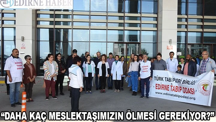 Edirne Tabip Odası Başkanı Dr. Mehmet Akbal, “Sağlıkta şiddetin önlenmesi, teklifimizin değerlendirilmesi ve sağlıkta şiddet yasasının çıkarılması için daha kaç meslektaşımızın ölmesi gerekiyor” vurgusunu yaptı.