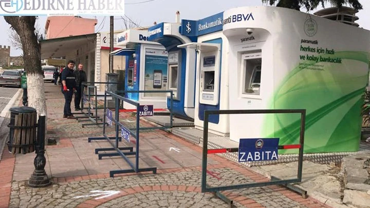 Enez ilçesinde yeni tip koronavirüs (Kovit-19) tedbirleri kapsamında bankamatik cihazları ve marketlerin önüne "sosyal mesafe şeridi" çekildi.