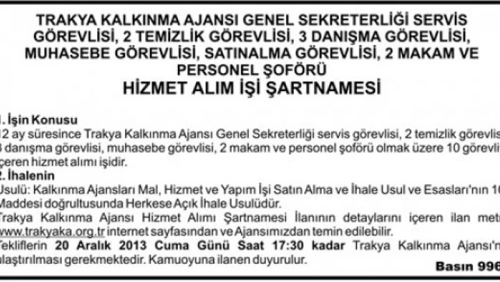 Haberler İlanlar ŞOFÖRÜ HİZMET ALIM İŞİ ŞARTNAMESİ ŞOFÖRÜ HİZMET ALIM İŞİ ŞARTNAMESİ TRAKYA KALKINMA AJANSI GENEL SEKRETERLİĞİ SERVİS GÖREVLİSİ, 2 TEMİZLİK GÖREVLİSİ, 3 DANIŞMA GÖREVLİSİ, MUHASEBE GÖREVLİSİ, SATINALMA GÖREVLİSİ, 2 MAKAM VE PERSONEL PAYLAŞ 16.12.2013 08:00 Güncelleme: 16.12.2013 08:00 TAKİP ET