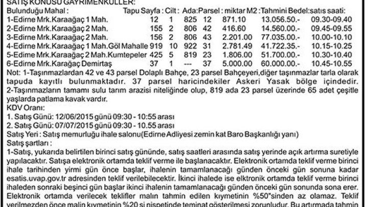 Haberler İlanlar TAŞINMAZIN AÇIK ARTIRMA İLANI TAŞINMAZIN AÇIK ARTIRMA İLANI T.C. EDİRNE, 1. (SULH HUKUK MAH.) SATIŞ MEMURLUĞU 2015/19 SATIŞ PAYLAŞ 24.04.2015 08:00 Güncelleme: 24.04.2015 08:00 TAKİP ET