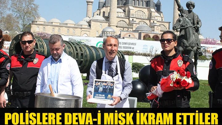 Edirne'nin fahri turizm elçisi Bahri Bey ve Arslanzade Arif Meriç, Türk Polis Teşkilatının 172. Kuruluş yılında Polislere Devai-misk ikram ettiler. Kutlamada açıklama yapan Bahri Bey, “172 yılından beri birliğimizin ve beraberliğimizin teminatı olan yeri geldiğinde canımızı emanet ettiğimiz, yeri geldiğinde malımızı emanet ettiğimiz, bizi huzur ve güven içerisinde yaşatmak için canını bir saniye dahi düşünmeden veren kahraman Türk Polisimizin 172. Yılını kutluyoruz. Buradan Selimiye'nin gölgesinden bütün şehitlerimizde dualarımızı gönderiyoruz. Nice 172. Yıllara diyoruz.” Dedi. Arslanzade Arif Meriç ise, “ Bende Bahri beyin söylediklerine katılıyorum. Düşünüz ki demin söylediğimiz gibi eğer biz burada ayakta durabiliyorsak onların güç kuvvet ve bu vatana sadaklarından dolayı duruyoruz. Neden bugün rahat rahat dükkanlarımızı açıyoruz. Rahat rahat alışverişler yapıyoruz. Huzur dolu şekilde eve gidip yatıyoruz. Nedir işte bu kahraman Türk Polisinin 172 yıldır canla başla ve kıyamete kadar da devam edeceği bir olaydır ve bütün kardeşlerimi beyfendimizin söylediği gibi şehitlerin şühedaların hepsinden rahmetle anıyoruz. Allah onlardan ebeden razı olsun diyorum.” Dedi. Daha sonra ise polislere Devai-Misk ikram edildi.