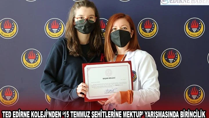 Milli Eğitim Bakanlığı Özel Eğitim Kurumları Genel Müdürlüğü tarafından düzenlenen "Özel Okullar 15 Temmuz Şehitlerine Mektup" Yarışması sonuçlandı. Yarışmaya katılan TED Edirne Koleji öğrencisi İrem Naz Çalışkan, "İl Birincisi" oldu.