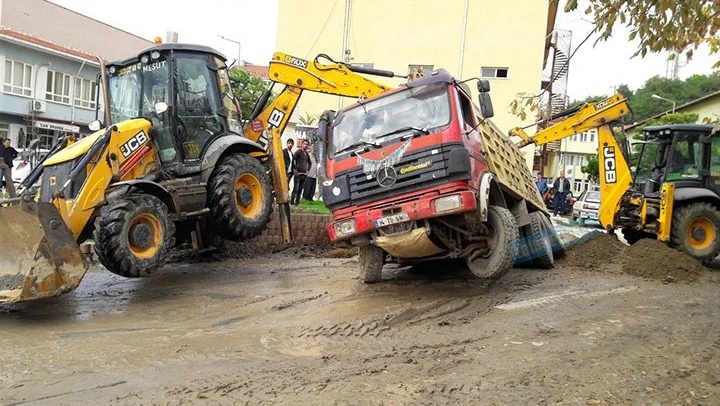 Alınan bilgiye göre, Saraçilyas Mahallesi'nde bir firmaya ait kum yüklü 34 TU 9805 plakalı kamyonun geçişi sırasında yolun bir kısmı çöktü. Sürücünün yaralanmadığı olayda, kamyonda hasar meydana geldi. Kamyon bulunduğu yerden iş makinesiyle kurtarıldı.