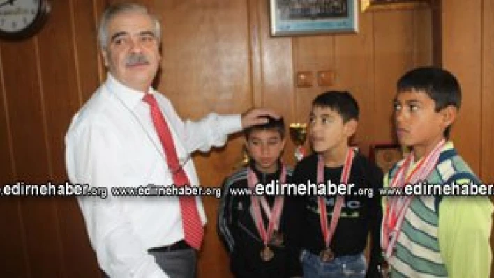 Edirne'de yapılan yarışmalarda dereceye giren Bademlik İlköğretim Okulu öğrencilerinden İl Birincisi Hasan Tek, İl İkincisi Yasin Kalaycı ve İl yedincisi Kadir Kırtıl, Özcan'ı makamında ziyaret ettiler.