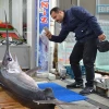 Balıkçı Sami Küçük, AA muhabirine yaptığı açıklamada, ilk kez bu ölçülerde bir kılıç balığını tezgahında sergilediğini söyledi.