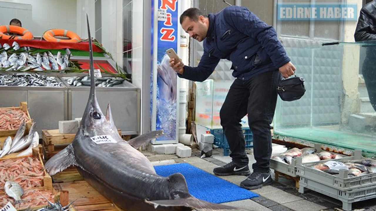 Marmara Denizi'nde yakalanan kılıç balığı, görenleri şaşırtıyor.