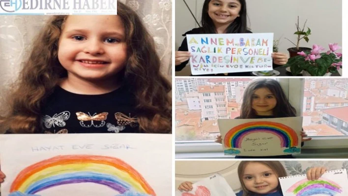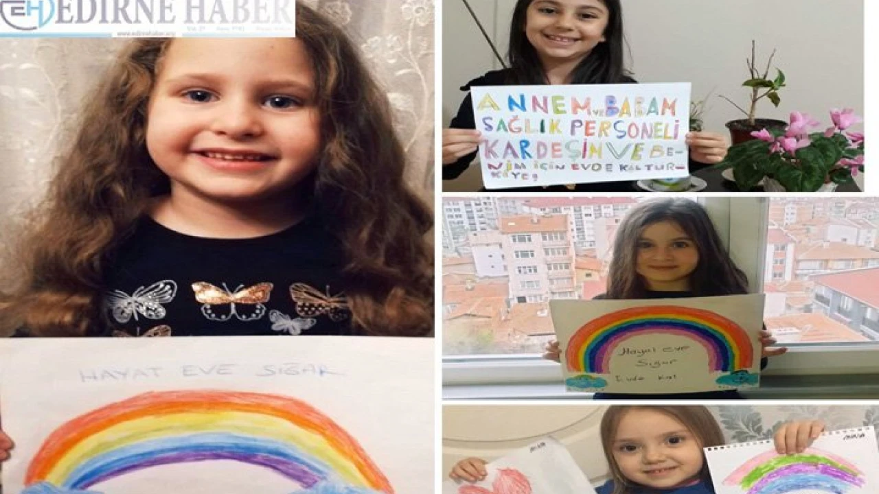 Gökkuşağı ve kalpler çizen çocuklar resimlerine "Annem ve babam sağlık personeli kardeşim ve benim için evde kal Türkiye", "Evde kal Edirnem", "Hayat eve sığar" gibi sloganları da yazdı.