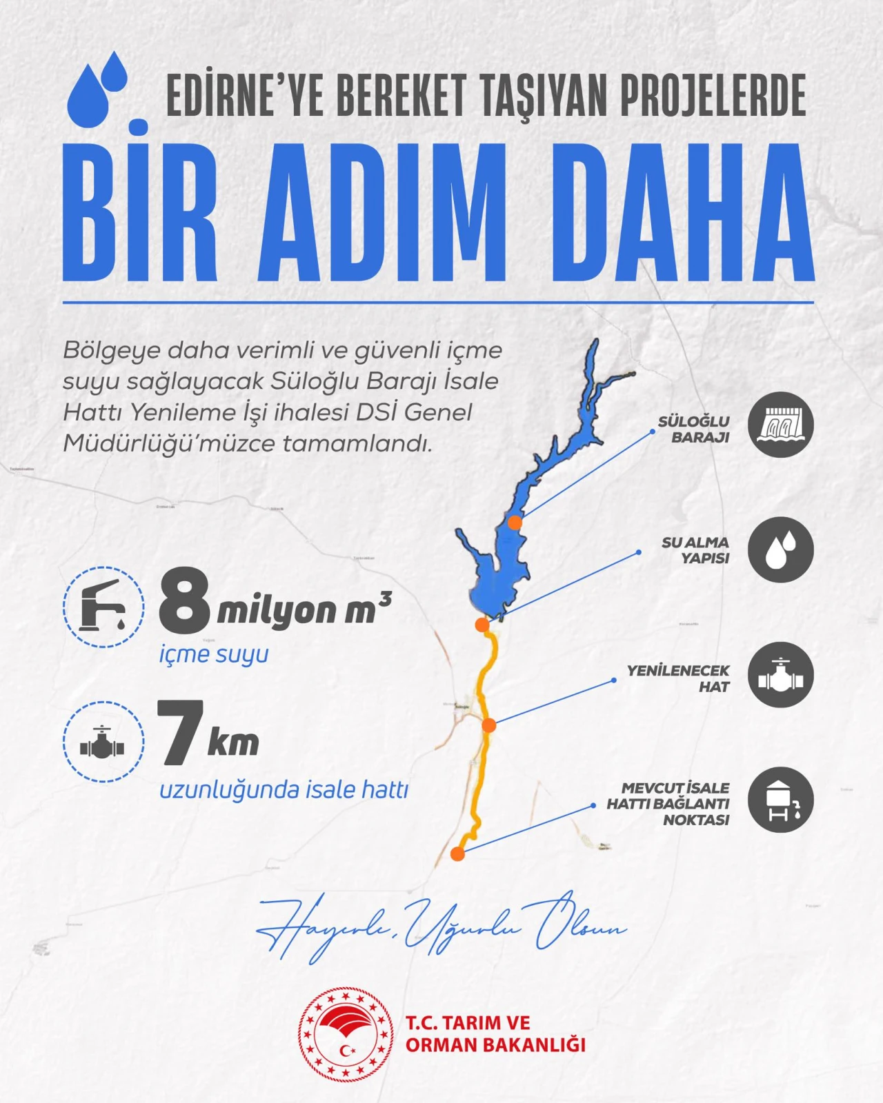 Edirne'ye içme suyu sağlayan Süloğlu Barajı İsale Hattı Yenileme İşi ihalesi tamamlandı. Tarım ve Orman Bakanı İbrahim Yumaklı, haberi sosyal medya hesabından yaptığı paylaşımla duyurdu.