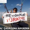 "Evde kal Türkiye" yazılı pankartla, evlerin üzerinde uçuş yapan Özkaya, virüs tehdidine dikkati çekti.