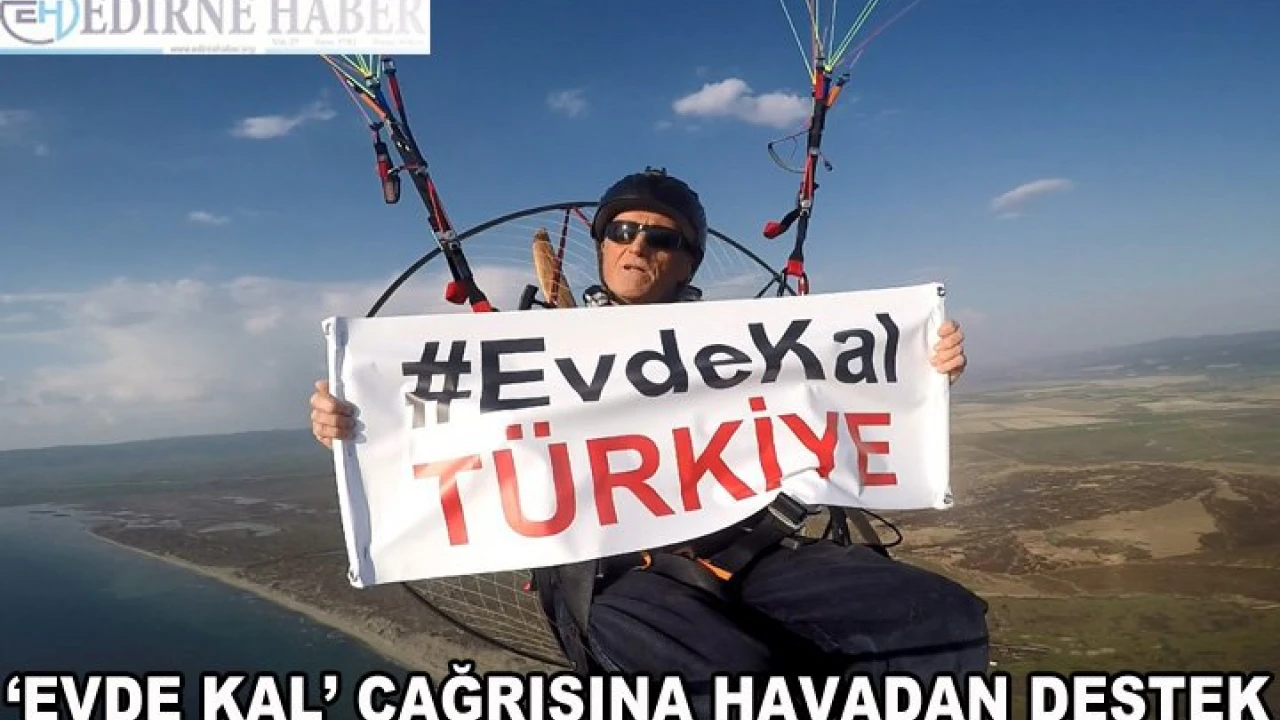 Edirne'de sivil havacı Yılmaz Özkaya, yeni tip koronavirüs (Kovid-19) salgınına karşı vatandaşları uyarmak amacıyla, paramotora bağladığı "Evde kal Türkiye" yazılı pankartla uçuş yaptı.