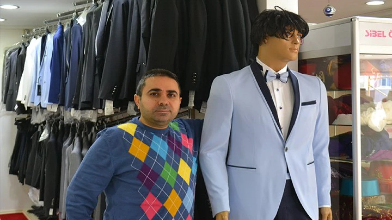 Çerkezköy'de bir esnaf, dövizini bozduran evlenecek çiftlere damatlık hediye ederken, gelinliğe ise yüzde 20 indirim yapıyor.