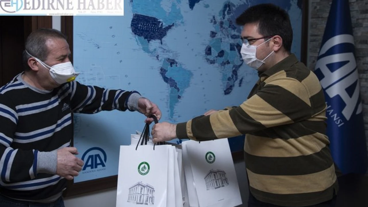 Edirne Belediyesi'nce yeni tip koronavirüs (Kovid-19) tedbirleri kapsamında gazetecilere eldiven, maske ve dezenfektandan oluşan koruyucu hijyen malzemeleri dağıtıldı.