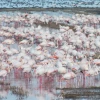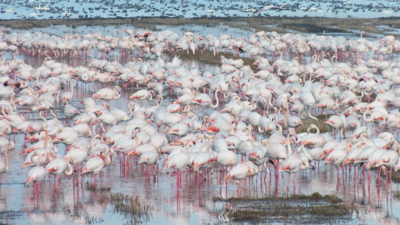 Gala Gölü Milli Parkı çevresindeki çok sayıda flamingo ve kuğu çeltik tarlalarında yiyecek arıyor.