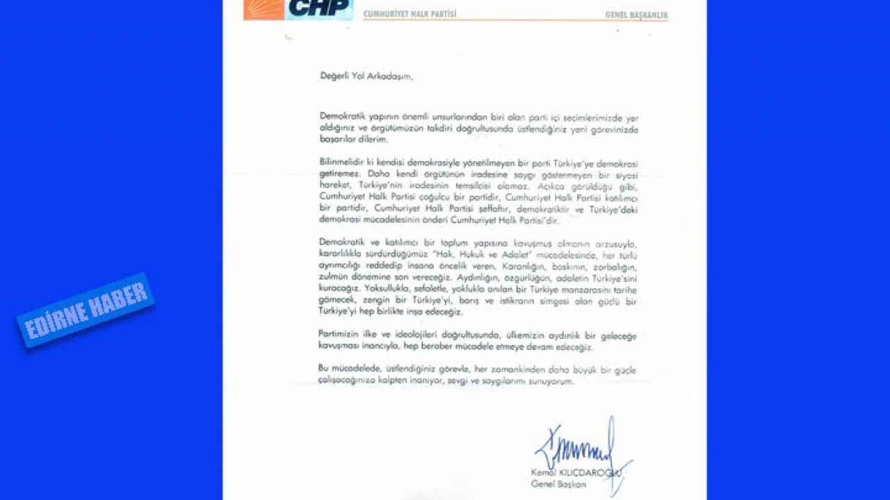 Cumhuriyet Halk Partisi Genel Başkanı Kemal Kılıçdaroğlu Cumhuriyet Halk Partisi Edirne İl Başkanı Fevzi Pekcanlı'ya hayırlı olsun mektubu gönderdi.