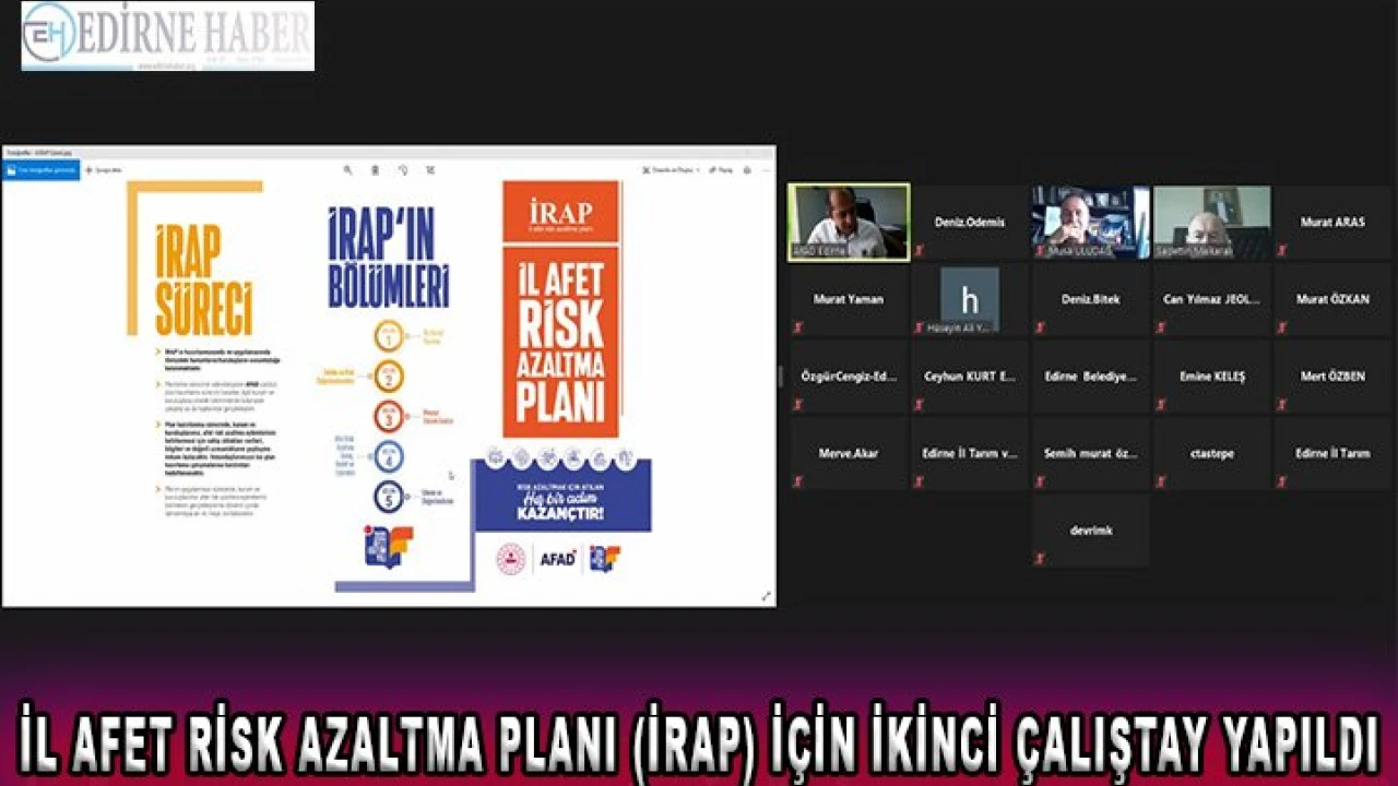 İçişleri Bakanlığı Afet ve Acil Durum Yönetimi Başkanlığı'nın (AFAD) başlattığı il afet risk azaltma planı (İRAP) çerçevesinde Edirne'de ikinci çalıştay gerçekleştirildi. Salgın nedeniyle online olarak gerçekleştirilen çalıştaya kamu kurum ve kuruluşlarının, STK, özel sektör, yerel yönetim ve üniversite temsilcileri katıldı.