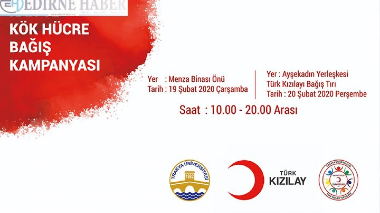Sağlık Kültür ve Spor Daire Başkanlığı öncülüğünde ve Türk Kızılayı Edirne Şubesi’nin destekleriyle 19 Şubat Salı günü Balkan Yerleşkesi Menza binası önünde, 20 Şubat 2020 Çarşamba günü ise Ayşekadın Yerleşkesi’nde kurulacak çadırlarda öğrenciler, akademisyenler ve çalışanların yanı sıra vatandaşlar kan bağışında bulunabilecek.