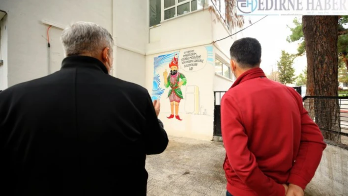 Sağlık çalışanları, sağlık müdürlüğü ve tarihi gar binası duvarına, gölge oyununun önemli tiplemesi olan ve Kırklarelili olduğu belirtilen Karagöz'ün yer aldığı karikatürler çizdi. Karikatürlere Trakya şivesi ile mesajlar yazılarak dikkat çekici hale getirildi.