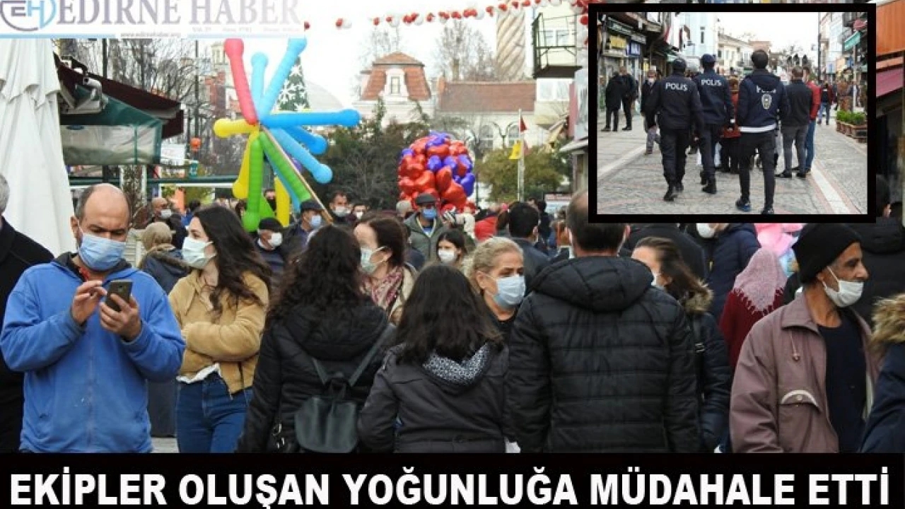 İçişleri Bakanlığı genelgesiyle koronavirüs tedbirleri kapsamında, ülke genelinde bugün saat 21.00'de başlayacak ve pazartesi saat 05.00'te sona erecek 80 saatlik sokağa çıkma kısıtlaması öncesinde, Edirne'de ki çarşı alışveriş yapanlarla doldu. Kısıtlamada yeni yılı da evlerinde geçirecek olan vatandaşlar, alışveriş ihtiyaçları için özellikle Saraçlar Caddesi'ni tercih ederken, çoğunluğun sosyal mesafeye uymadığı görüldü. Edirne İl Emniyet Müdürlüğü ekipleri sosyal mesafeye uymayan vatandaşları uyararak kuralları hatırlattı. Bu tablo endişe uyandırırken, kent genelinde emniyet ekipleri ve zabıta ekipleri de koronavirüs tedbirlerine uyulması yönünde denetimlerini artırdı.