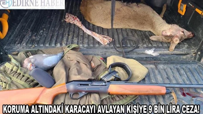 Edirne'de koruma altındaki türlerden olan karacayı vuran kişiye koruma altındaki yaban hayvanını vurmaktan ve yasak günde avlanmaktan bin 246 lira idari, 1 adet Karaca ve 3adet tahtalı vurmaktan 8 bin 429 lira olmak üzere toplam 9 bin 685 lira ceza uygulandı.