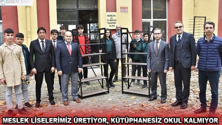 "Kütüphanesiz Okul Kalmayacak" Projesi kapsamında harekete geçen Edirne Mesleki ve Teknik Anadolu Lisesi öğretmen ve öğrencileri atölyelerinde kütüphane kurulumu ile kütüphane yenilenmesine ihtiyaç duyulan okullar için üretime başladı.