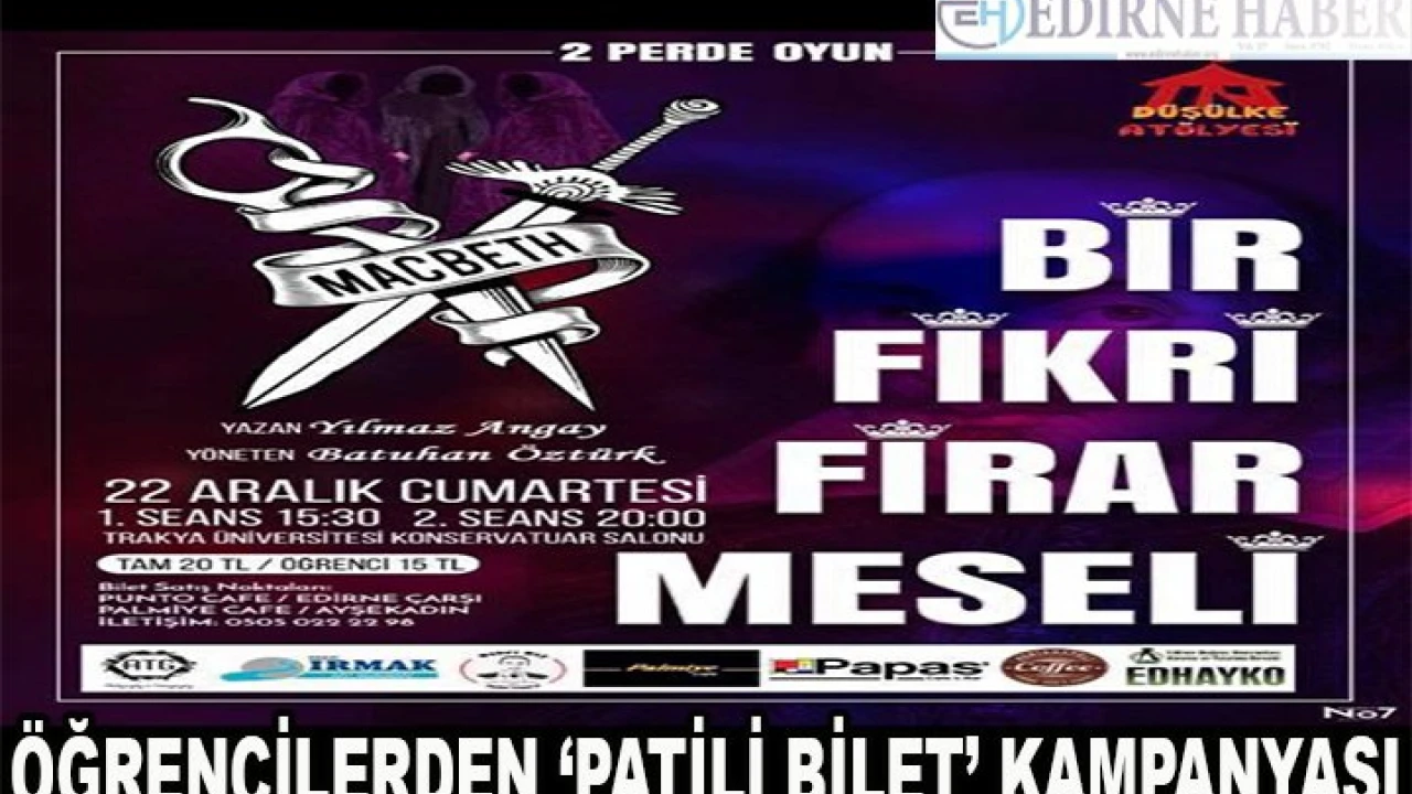 Trakya Üniversitesi öğrencileri, Edirne Hayvanları Koruma Derneği (EDHAYKO)’a katkı sağlamak amacıyla ‘Patili Bilet’ kampanyasını başlattılar. Trakya Üniversitesi Konservatuarında sergilenecek “Bir Fikri Firar Meseli” oyunu için ‘Patili Bilet’ alanlar hem sanata katkı sağlamış, hem de sokak canlarına yardım etmiş olacaklar. Bilet satışlarından elde edilecek olan gelir sokak hayvanları yararına kullanılacak.