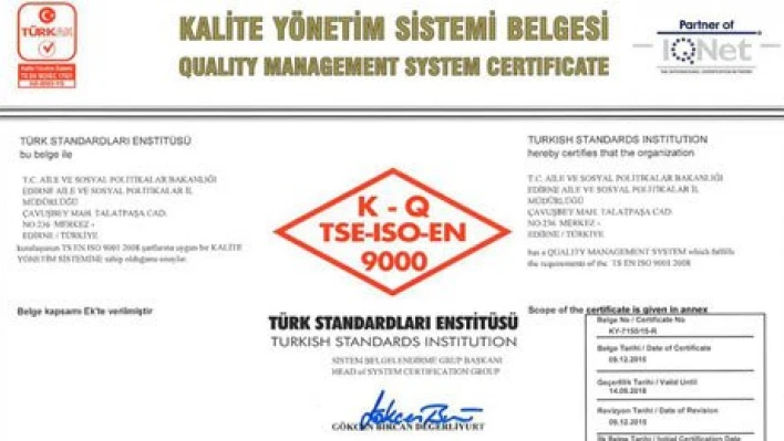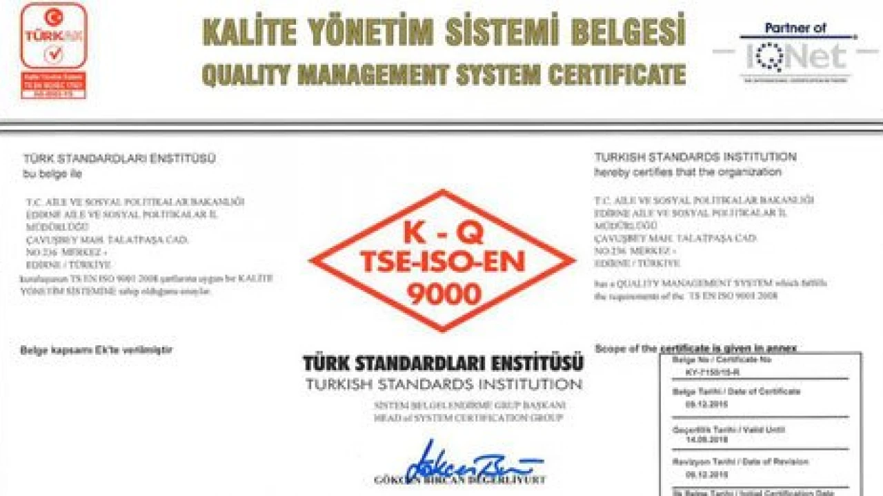 Konu ile ilgili bilgi veren Bilgin Özbaş, “Aile ve Sosyal Politikalar Bakanlığımız Sistem Belgelendirme çalışmaları kapsamında Edirne Aile ve Sosyal Politikalar İl Müdürlüğümüz ve bağlı kuruluşlarımızda yürütülen tüm hizmetlerin Kalite Yönetim Sistemine uygun olarak sürdürülmesi amacı ile Ağustos 2015 içinde başlattığımız Kalite Yönetim Sistemi uygulaması kapsamında Bakanlığımız Kalite Yönetimi Sistem Uzmanları tarafından yapılan iç tetkikler sonrasında Türk Standartları Enstitüsüne başvuru yapılmıştır.Yapılan başvuru neticesinde TSE dış tetkikçileri tarafından Edirne Aile ve Sosyal Politikalar İl Müdürlüğümüz ve bağlı kuruluşlarımızda Kasım 2015 tarihi içerisinde tamamlanan dış tetkikler sonucunda Türk Standartları Enstitüsü tarafından hizmet kalitemiz; TS EN ISO 9001:2008 Kalite Yönetim Sistemi Belgesi ve ayrıca IQNET Sertifikası ile belgelendirilmiştir.Kalite Politikamız gereği tüm hizmetlerimizi İl Müdürlüğü ve bağlı kuruluşlarımızda TS EN ISO 9001:2008 standartları ve IQNET sertifikası kapsamında sürdürmeye devam edeceğiz.” Dedi.