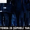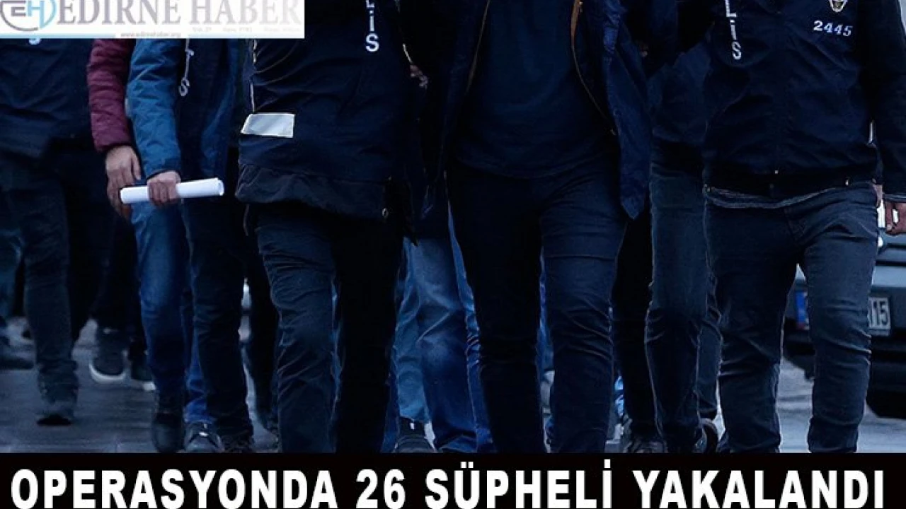 Edirne Emniyet Müdürlüğü Terörle Mücadele Şubesi ekiplerince, haklarında yakalama kararı bulunan 26 şüpheli, Edirne merkez olmak üzere, İstanbul, Ankara, İzmir, Bursa, Tokat, Konya, Bayburt, Trabzon, Isparta ve Siirt illerinde gözaltına alındı.