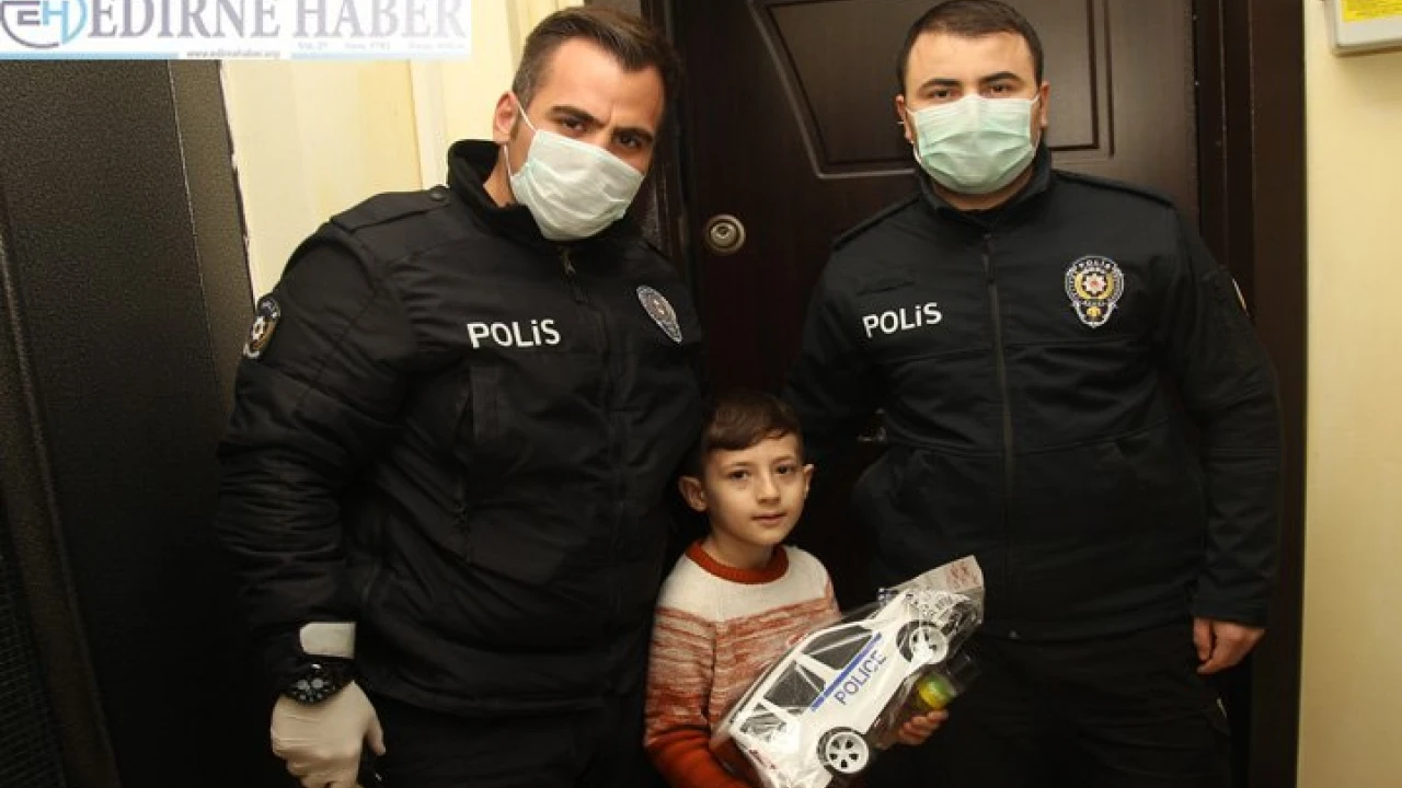 Bunun üzerine İlçe Emniyet Müdürlüğüne bağlı polis ekipleri aldıkları oyuncak polis arabasını İlker Aslan'ın yaşadığı eve götürerek hediye etti.