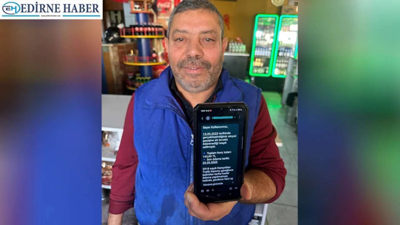 Edirne'de yaşayan Kazım Kabaca, cep telefonuna gelen otoyol geçiş cezası mesajıyla neye uğradığını şaşırdı. Mesajda, Kabaca'nın 15.09.2025 tarihinde otoyol kullandığı ileri sürülerek ödenmemiş 142 TL borcu bulunduğu, ödeme yapılmazsa yasal işlem başlatılacağı ifade edildi. Mesajda ayrıca Karayolları Genel Müdürlüğü adına hazırlanmış gibi görünen bir ödeme linki de yer aldı.