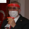 Belediye Başkanı Helvacıoğlu maske ve gözlükle toplantıya katılırken, diğer yetkililer aralarında ikişer koltuk boşluk bırakarak oturdu.