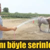 Edirne'de bir at çiftliği sahibi aşırı sıcaktan bunalan hayvanları ıslatarak serinletiyor.