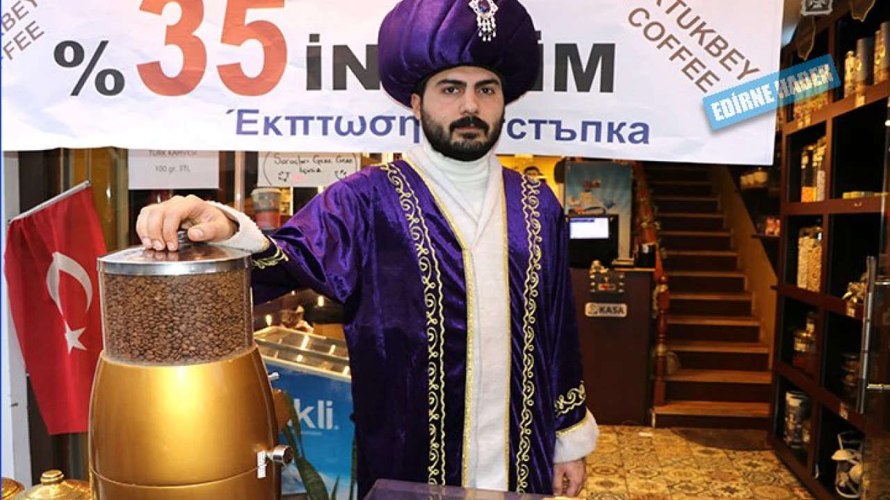 Kentin en işlek mevkisi Saraçlar Caddesi'ndeki iş yerinde giyindiği kavuk, çarık ve kaftanıyla değirmenden çektiği kahveyi vatandaşlara sunan İlhan, sunum sırasında çalan mehter marşlarıyla da merak uyandırıyor. Türk kahvesinin aslına uygun yapıldığı ve sunulduğu iş yerinde, çalışanları da giydikleri fes ve yelekleriyle dikkat çekiyor. Kahveci Burak İlhan, AA muhabirine yaptığı açıklamada, Edirne'nin Osmanlı'ya başkentlik yapan tarihi bir şehir olduğunu söyledi. Osmanlı döneminde kahvenin çokça tüketildiğini anlatan İlhan, şunları söyledi: "Gerçek Türk kahvesini sultan kıyafetli sunumumuzla hatırlatmak istedik. Yaklaşık bir haftadır sultan kıyafetiyle kahve sunuyoruz. Osmanlı'yı esnaf olarak da yansıtmak için bu kıyafeti kullanıyoruz. İnsanların da dikkatini çekti. Özellikle Edirne'ye gelen yerli yabancı turistlerin ilgisini çekiyor konseptimiz. Kahvemizin tadına bakanlar fotoğraf çekilmeden buradan ayrılmıyor. Herkesi hem kahvemizin tadına bakmaya hem de Edirne'yi görmeye bekliyoruz. Osmanlı'da Türk kahvesinin Fatih Sultan Mehmet döneminde geldiğini biliyoruz. Yurtdışında, diğer ülkelerde kahvede genelde telve yoktur, yapımında da cezve kullanılmıyor. Kahvede telve olması Türk kahvesinin özelliğini ön plana çıkarıyor." Hafta sonu tatilini fırsat bilerek ailesiyle İstanbul'dan Edirne'ye gelen Mustafa Demirbaş, kahvecinin tarihi yansıtan sunumunu beğendiklerini ifade etti. Tarihin gelecek nesillere aktarılmasının önemli olduğunu belirten Demirbaş, "Arkadaşlar çok güzel bir konu düşünmüş ve yapmış. Herkesin ilgisini çekiyor. İki aile geldik, kahvemizi içtik Edirne'yi geziyoruz. Selimiye Camisi'ni çok beğendik herkesin gelip görmesini tavsiye ederiz." diye konuştu.