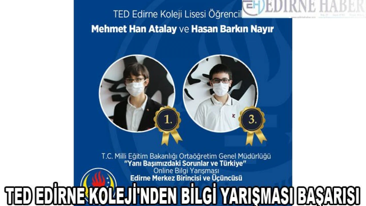 Milli Eğitim Bakanlığı tarafından düzenlenen 'düzenlenen "Yanı Başımızdaki Sorunlar ve Türkiye" adlı liseler arası online bilgi yarışmasında TED Edirne Koleji öğrencilerinden Mehmet Han Atalay, Edirne Merkezde birinci Hasan Barkın Nayır ise üçüncü olmayı başardı.