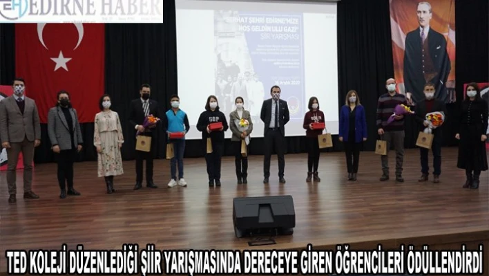 TED Edirne Koleji tarafından Büyük Önder Mustafa Kemal Atatürk'ün Edirne'ye gelişinin 90. yılı kapsamında İl genelinde düzenlenen "Serhat Şehri Edirne'mize Hoş Geldin Ulu Gazi" adlı şiir yarışmasında dereceye giren öğrencilere ödülleri koronavirüs tedbirleri kapsamında düzenlenen törenle verildi.Â